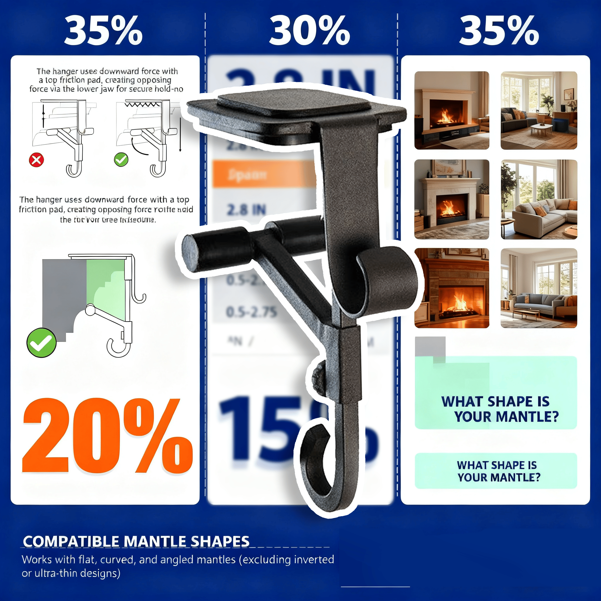 • Adjustable Fit – Easily adapts to mantles up to 8.5 inches thick for a perfect, secure hold.